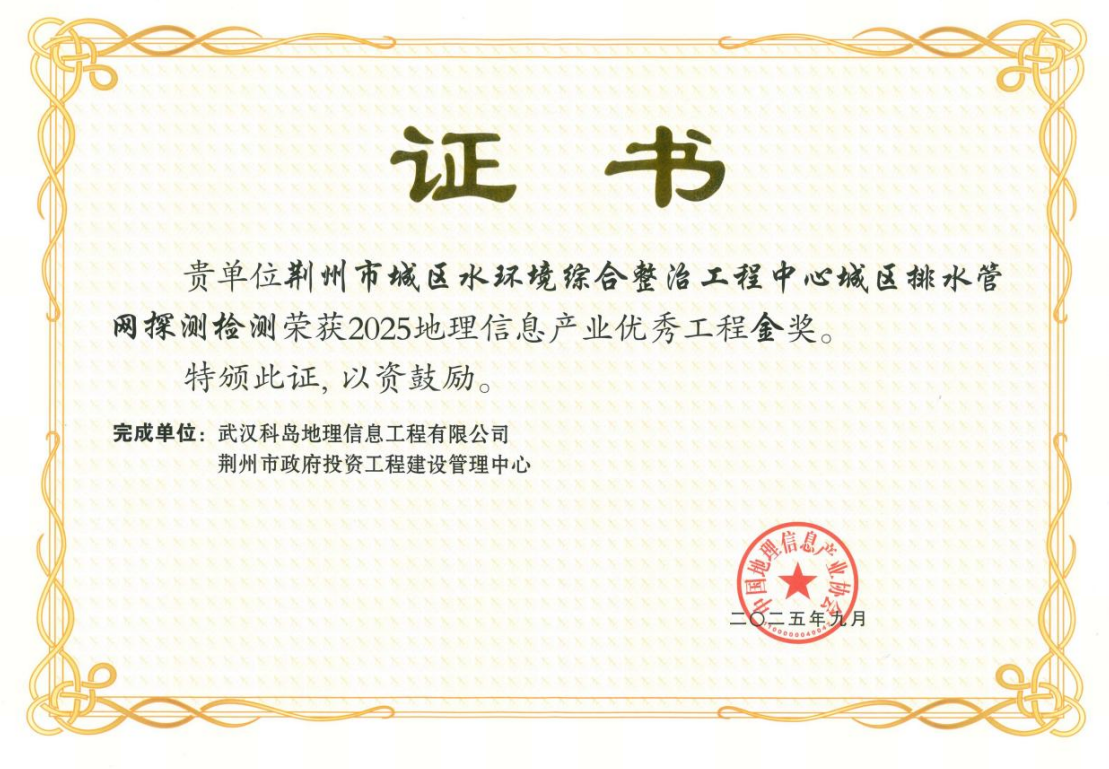 近日,中國地理信息產(chǎn)業(yè)協(xié)會公布了2025地理信息產(chǎn)業(yè)優(yōu)秀工程評選結(jié)果,武漢科島公司“荊州市城區(qū)水環(huán)境綜合整治工程中心城區(qū)排水管網(wǎng)探測檢測項(xiàng)目”榮獲金獎。